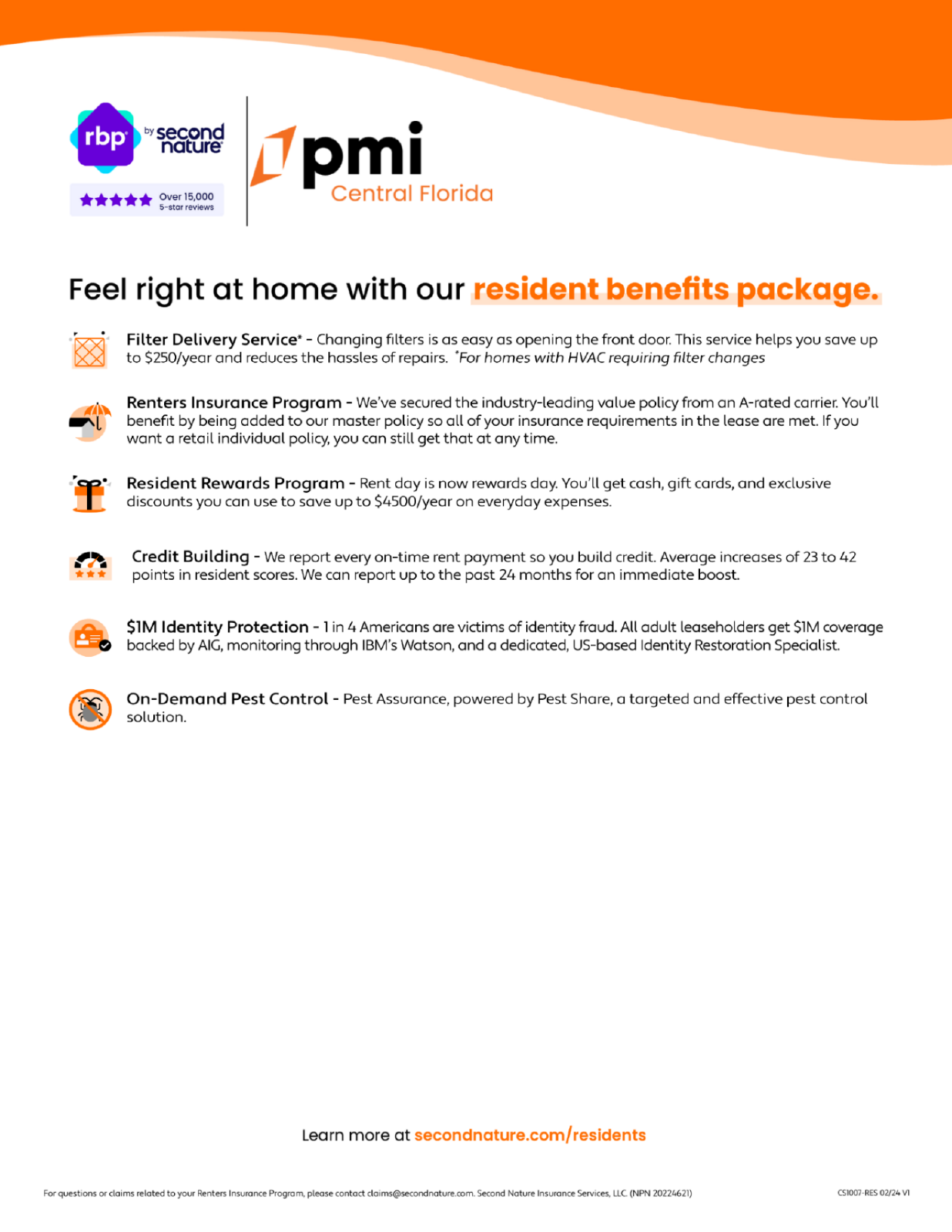 **At PMI - Central Florida, we strive to provide an experience that is cost-effective and convenient. That’s why we provide a Resident Benefits Package (RBP) to address common headaches for our residents. Our program handles insurance, air filter changes, credit building, and rent rewards at a rate of $42.00/month, added to every property as a required program. More details upon application.